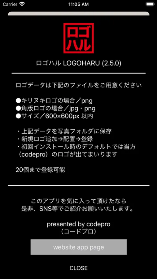 ※初回インストール時にはダミーのロゴ(codepro)が表示されます。