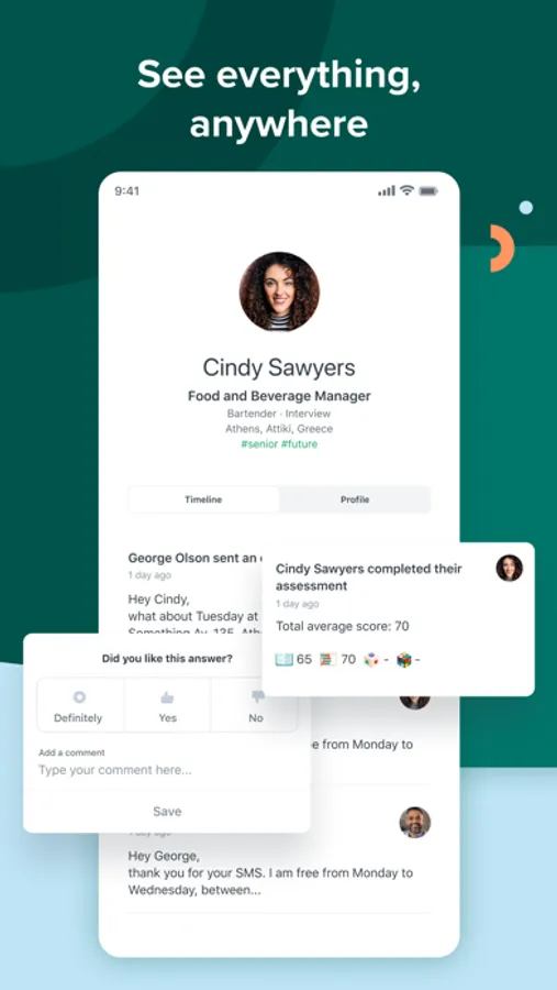 -Team collaboration: Review resumes and interview scorecards, send notifications, and gather feedback from your hiring teams.