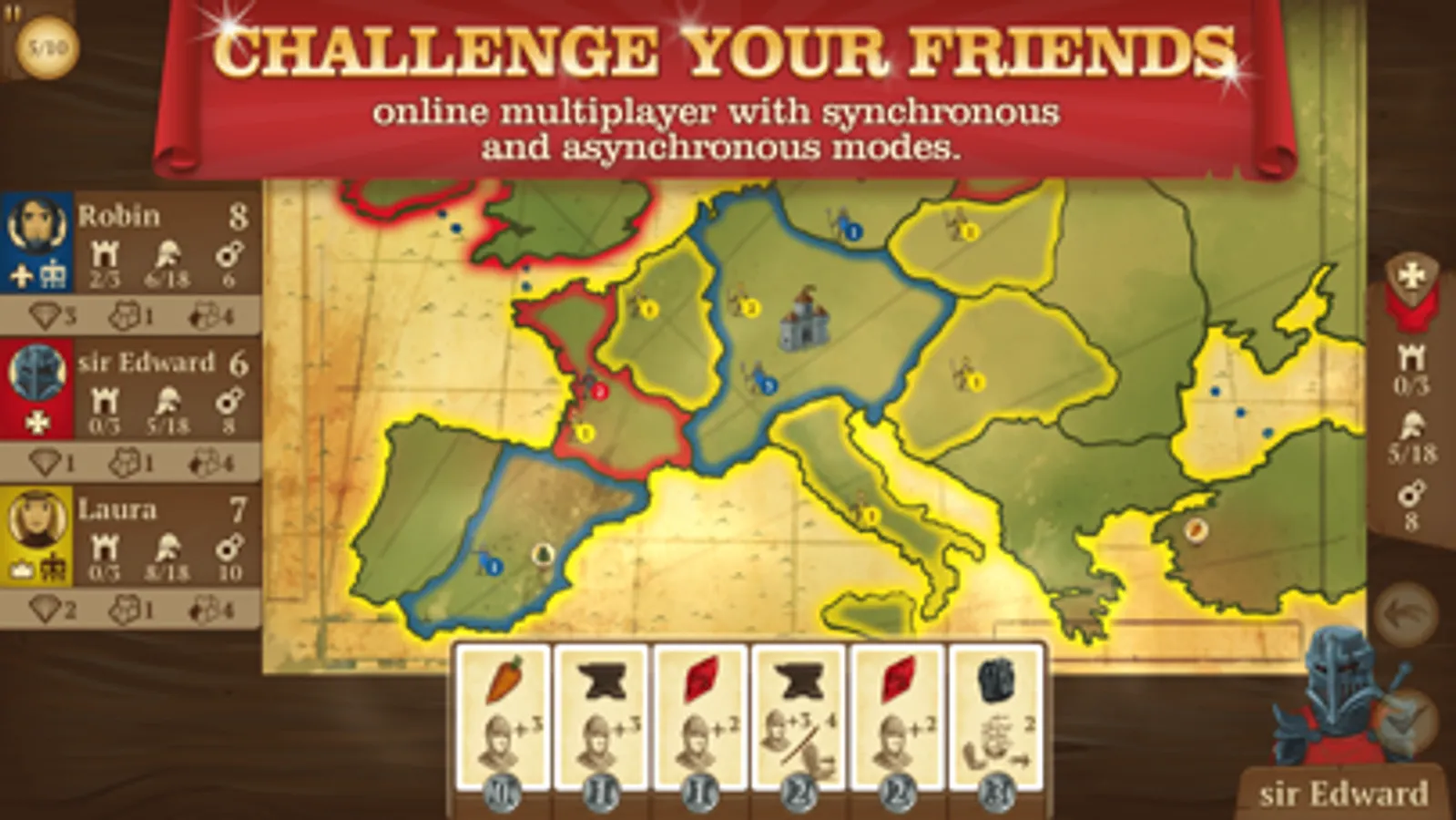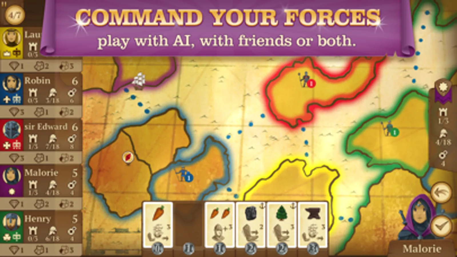 In Eight-Minute Empire, 2-5 players take turns selecting a card from the six displayed. This card gives the player a resource, and also has an action which the player takes immediately. Actions help players take over the map, but the resources are worth points at the end of the game, so players have to balance the two aspects. Players spread across the map in order to collect points at the end of the game by having majority control in regions and continents.