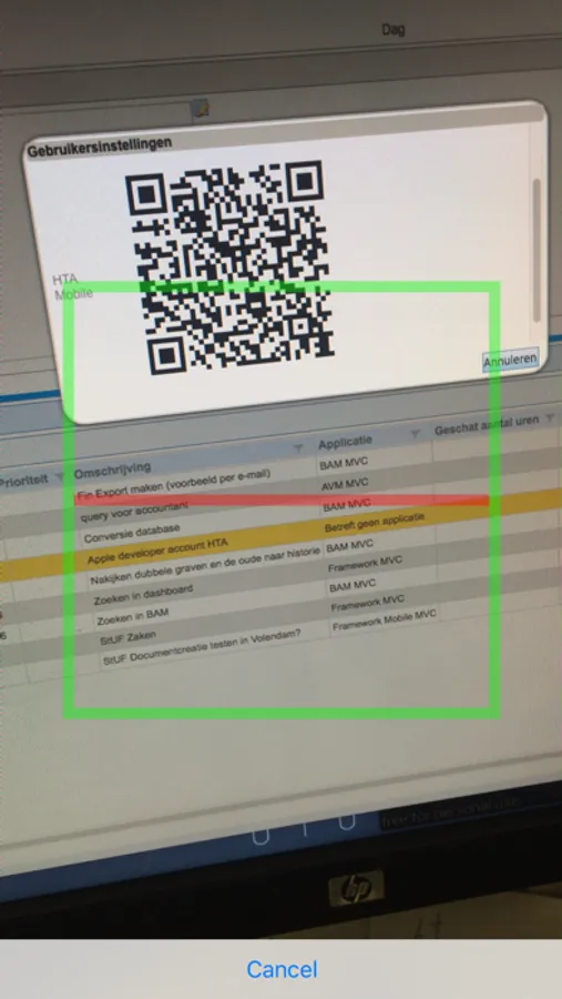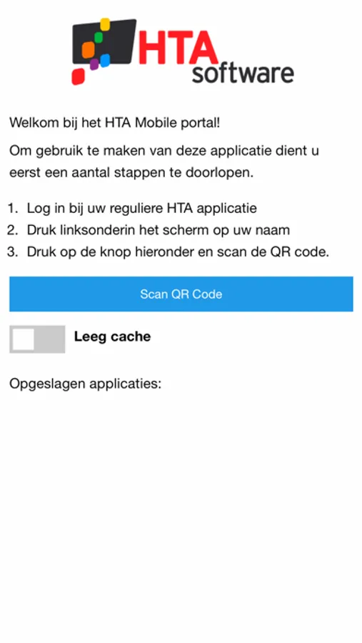 Na het downloaden van de app kan deze alleen geactiveerd worden door de bijbehorende QR-code te scannen. Deze kan gevonden worden in het scherm van uw gebruikelijke HTA Software applicatie door op de gebruikersnaam links onderin te klikken. ( te vinden in AVM2020, BAM2020, CRM2020, KRM2020, VIM2020)
