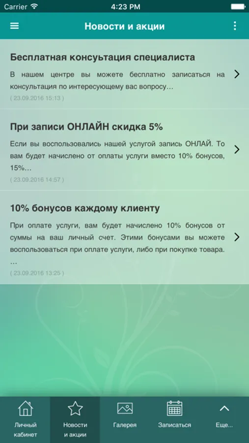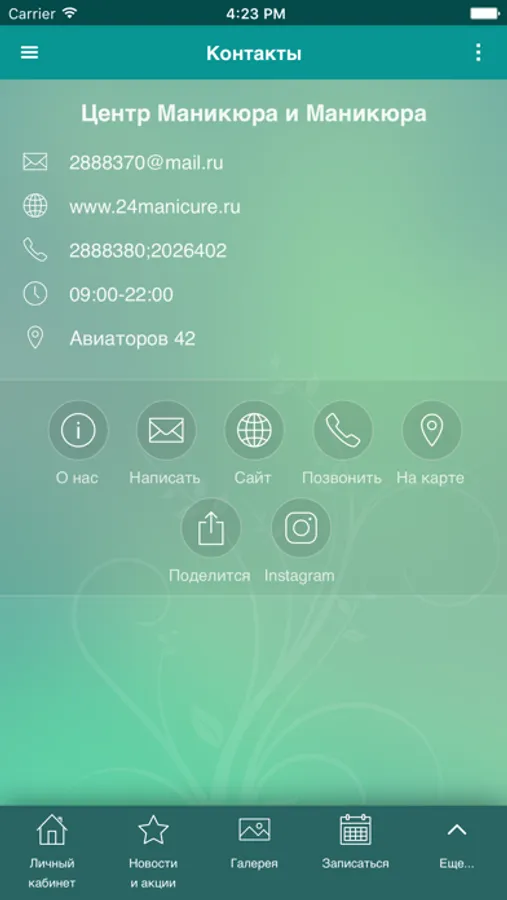 Для вашего комфорта и удобства мы запустили приложение – это Ваш личный кабинет в Центре маникюра. Запись Онлайн (в любое удобное для вас время), Ваш лицевой счет (бонусы, депозит), знать обо всех событиях центра (новости, акции). А также получать информацию об остатке услуг на абонементах и остатках денежных средств на сертификатах, об окончании их срока действия.