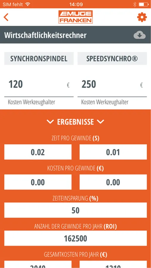 For the collet holder EMUGE Speedsynchro® and for FRANKEN Circle Segment End Mills is a Return-on-Investment-Calculator installed. It enables a comparison of cost and time against conventional machining processes.