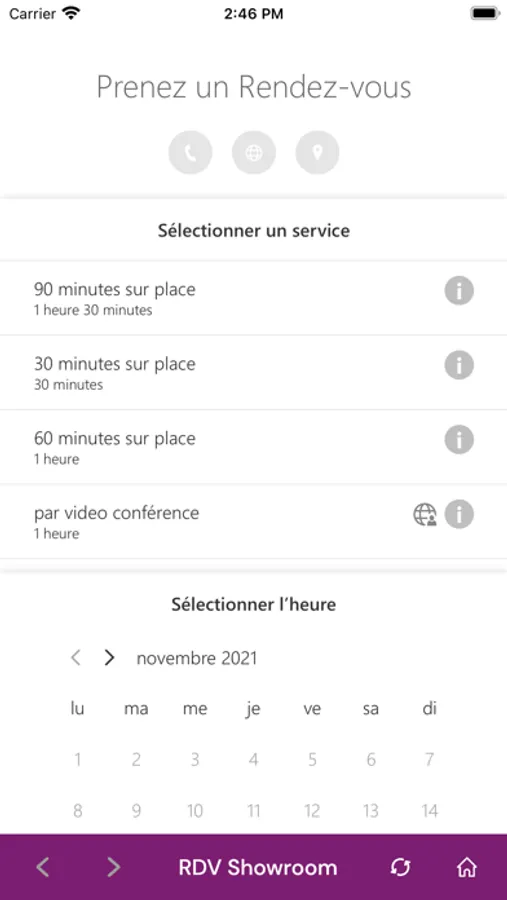 - Calendrier pour prendre un rendez-vous en ligne pour le show-room