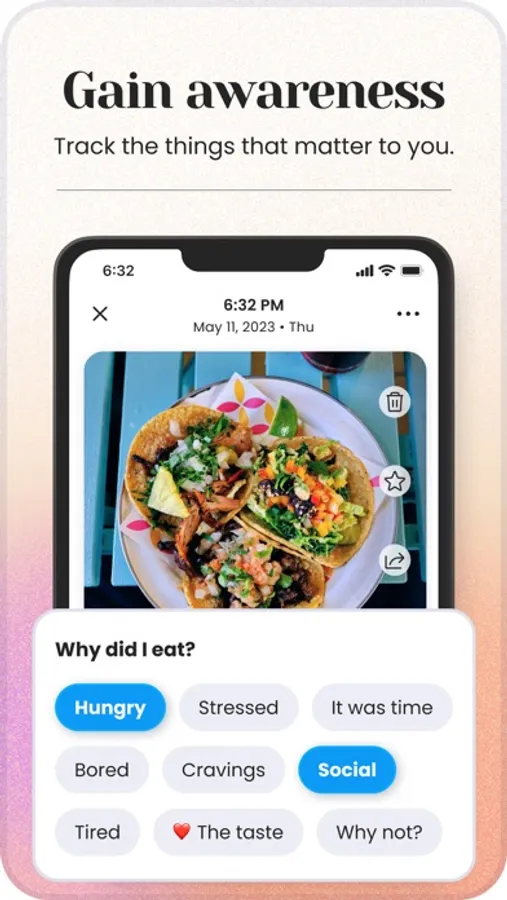 - Create fully custom smart reminders, so you never forget a meal again, or to remember to reflect on a meal.