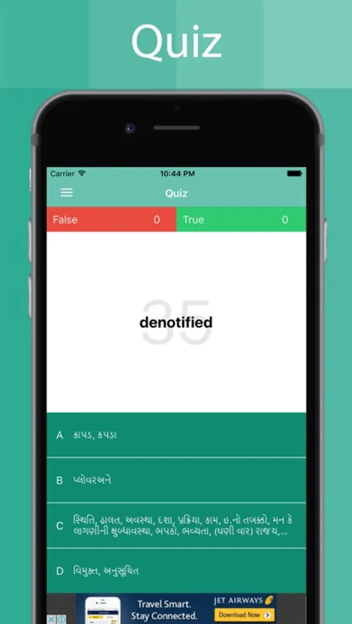 This Gujarati Dictionary Contains Quiz too. you can test you Gujarati skills using this multiple choice quiz and you can improve your Gujarati.