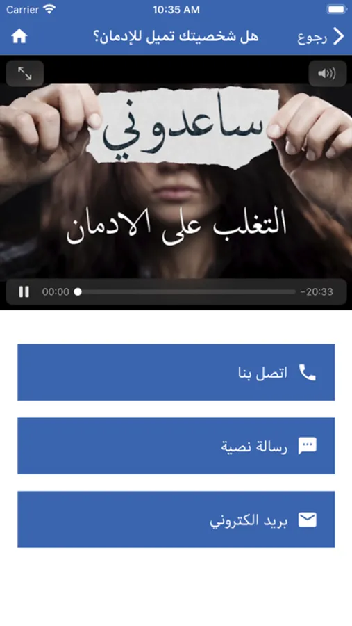 مع النتيجة سيظهر لك مقال عن طرق تطوير النفس وعلاجها، وفيديو لنفس الغرض، ومعلومات للتواصل معنا من خلال: الاتصال بنا، والرسائل النصية، أو البريد الإلكتروني.