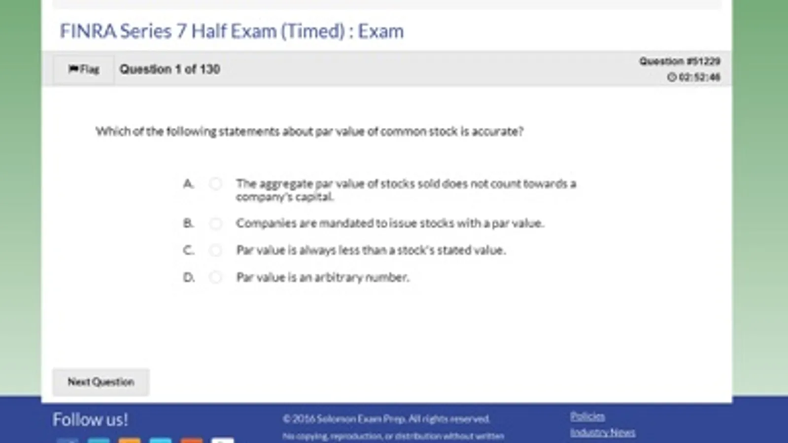 Solomon Exam Prep has helped thousands of financial professionals pass their FINRA, NASAA, and MSRB licensing exams, including the Series 6, Series 63, Series 65, Series 66, Series 7, Series 24, Series 26, Series 27, Series 28, Series 50, Series 51, Series 52, Series 53, Series 62, Series 79, Series 82 and the Series 99.