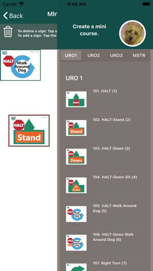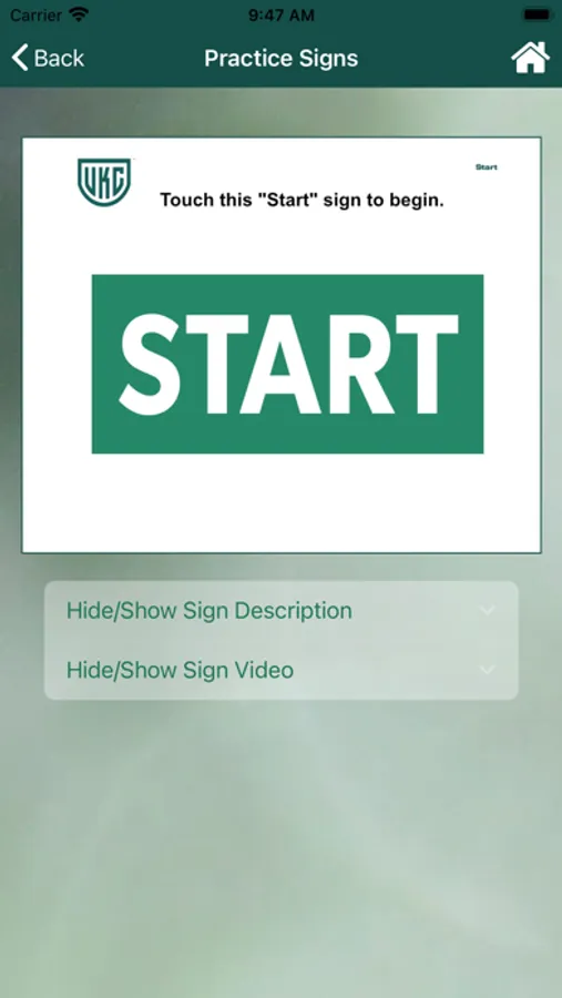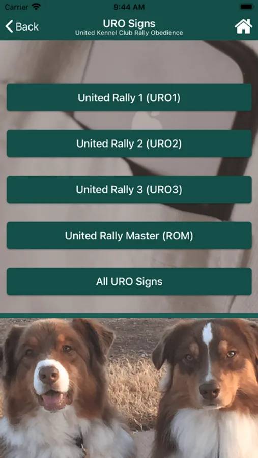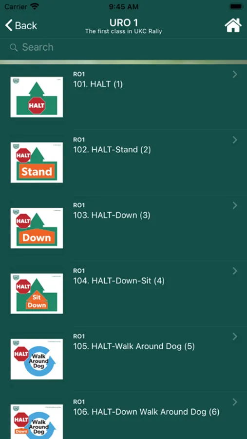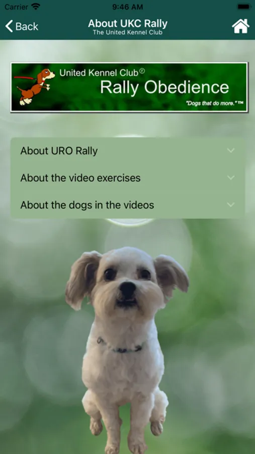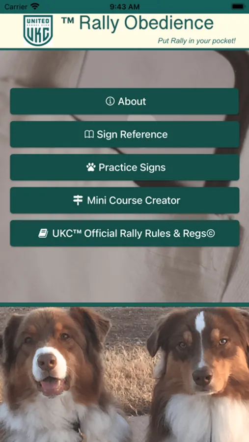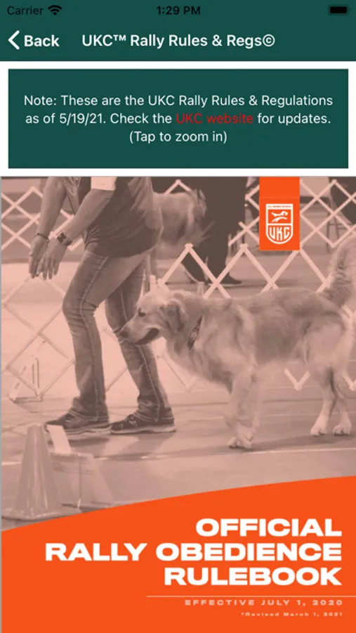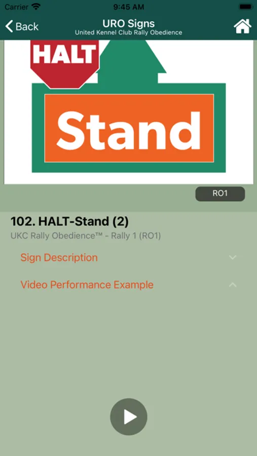 The rally signs are included with descriptions and videos of each sign's performance! There is an area where you can also practice the signs randomly. There is a small a mini-rally course creator and a link to the UKC primary Rules Booklet using the internet link.