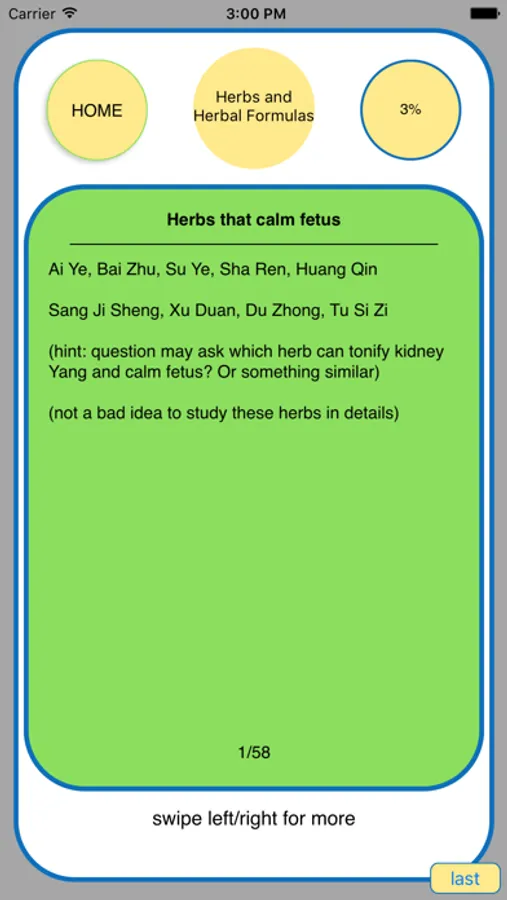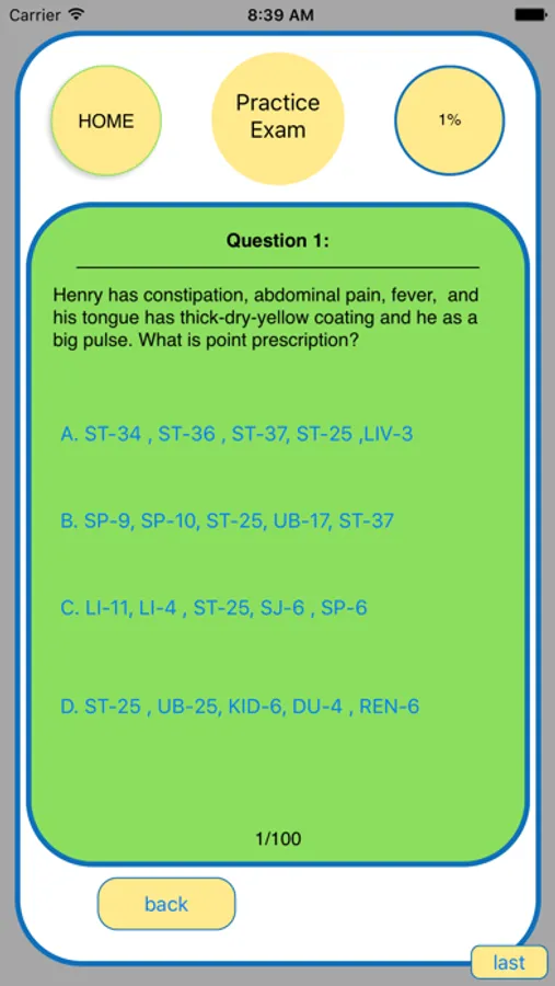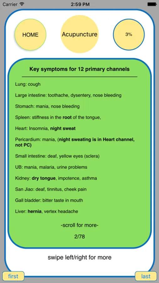 This app is designed to highlight key points that may appear on the exams and also summarize points that are not explicitly explained in text books. For example, the sequence of channels & points starting from the center line at the front: Ren17, Kid23, ST17, PC1, SP18, GB23, GB22; Asthma: deficiency case use UB13, excess case use Ding Chuan; the 2 extra meridians that cross point GB20 are Yang Qiao and Yang Wei; the common herbs in Wu Ling San and Zhu Ling Tang are Fu Ling, Zhu Ling and Ze Xie; Yang Ming Channel vs. Yang Ming Fu Organ disease: the key differentiating point is that Yang Ming Fu Organ disease has constipation because heat binds with stools and Yang Ming Channel disease doesn’t.