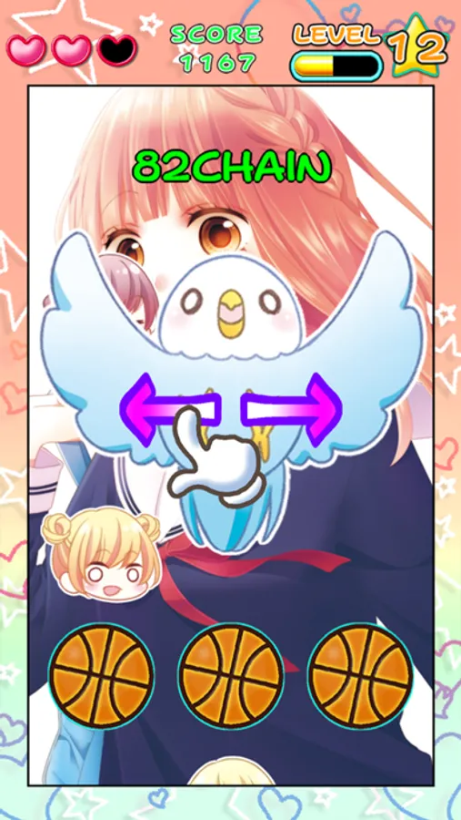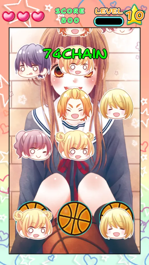 まんがに出てくるキャラクターの顔が上から落ちてくるから、バスケットボールに顔が重なったタイミングでボールにタッチしよう。いいタイミングでタッチが出来ればポイントが増えていくよ。バスケットボールを通り過ぎてしまうと、ライフが1つ減るから注意!