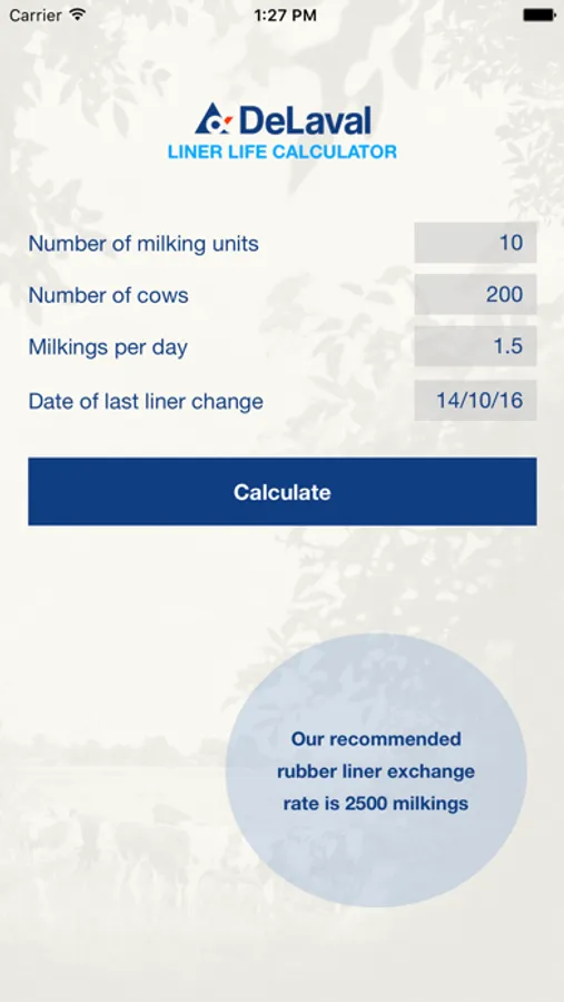DeLaval Liner Life Calculator allows you to easily calculate when your next milking liner change should be. Simply enter a few bits of information about how you milk and you will receive a recommendation of how often you should change your liners to ensure optimal performance.
