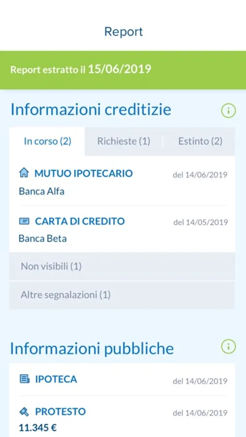 - 7 REPORT in un anno con la valutazione della tua affidabilità creditizia e i dettagli sulle tue informazioni creditizie presenti nel Sistema di Informazioni Creditizie di CRIF e le informazioni ottenute dagli archivi pubblici (es. Protesti, ipoteche, pignoramenti, ecc.).