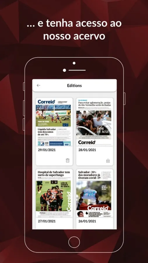 Esse é o aplicativo do Correio, o jornal de maior audiência da Bahia e do Nordeste. Com ele instalado, você vai ter uma experiência incrível de leitura de notícias, podendo escolher e acompanhar seus assuntos favoritos, receber notificações sempre que algo importante acontecer, salvar reportagens para ler depois ou compartilhar imediatamente com amigos e família.Além disso, você pode ler a edição diária do jornal, com acesso a todas as edições publicadas desde 2008.
