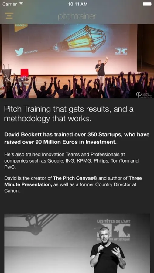 Looking for investment? Need to make a great pitch to your bosses? David Beckett has trained over 1400 Startups to raise over $390 Million in investment, He's also trained over 20,000 professionals in 31 countries, at companies such as Google, PwC, Tommy Hilfiger, Shell and Booking.com to help their innovation and sales teams pitch for resources and business. In this App, you get video tips, Pitch Tip cards, and videos to explain The Pitch Canvas©. You also get an overview of the acclaimed Open-3-Close© pitch model, as well as a selection of great pitches by our clients.
