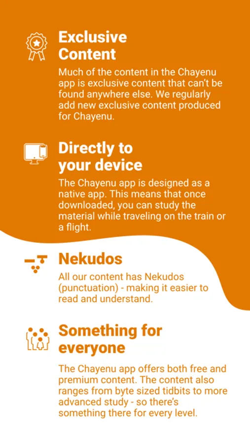 Chayenu app delivers your weekly Torah study content to your devices. The content is designed specifically for mobile devices and the text is clear and easy to read. Users can use in landscape or portrait modes while maintaining the flow of the text. Users can choose a font size that best suites their needs.