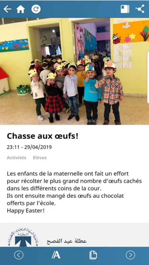 Cette application sur le téléphone mobile permet à tous les parents et élèves d’être au courant des évènements qui passent à l’école. Elle comprend les notifications, les nouvelles, l’emploi du temps scolaire, l’agenda quotidien (devoirs –leçons-évaluations…) et toutes les annonces importantes.