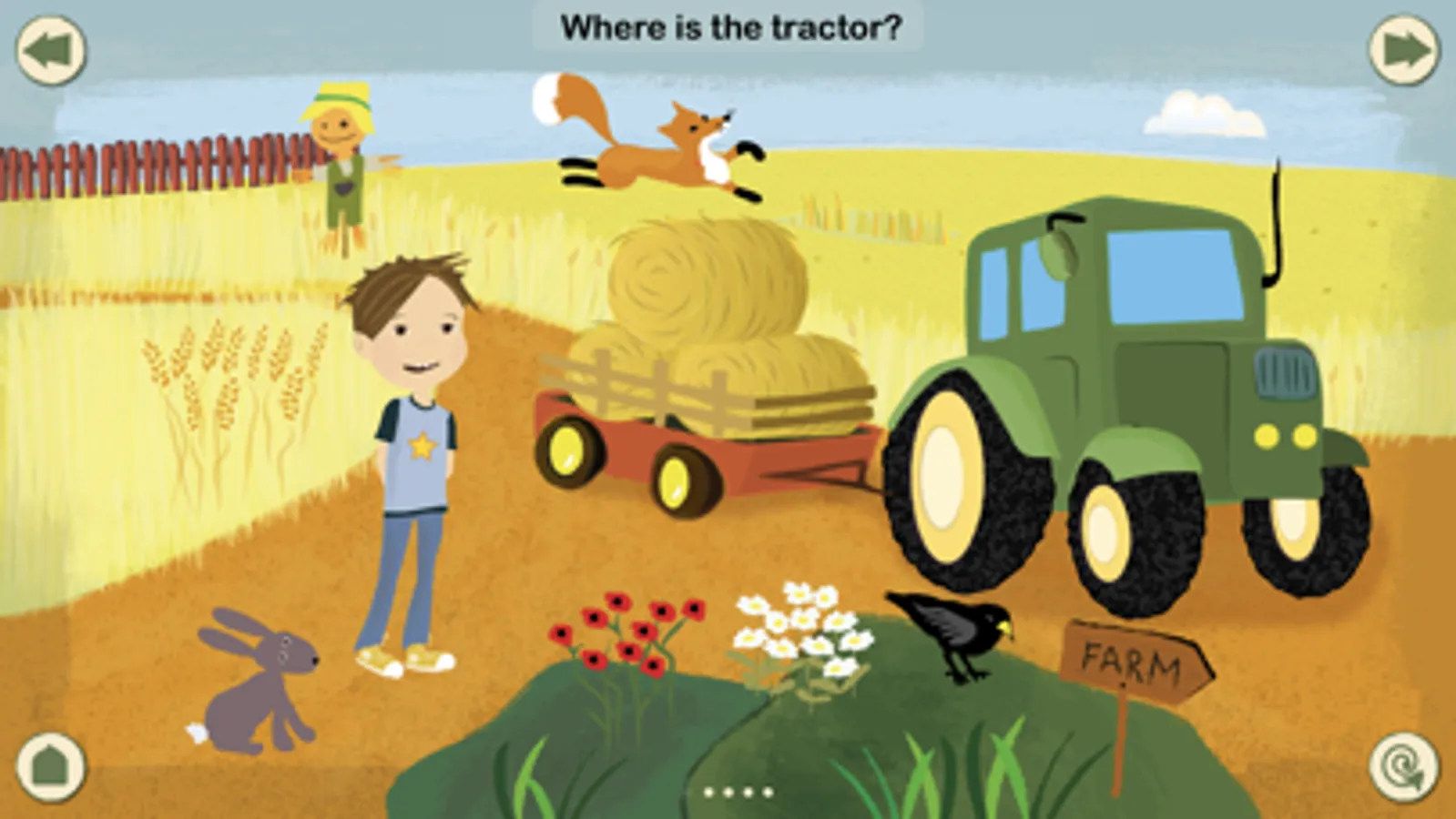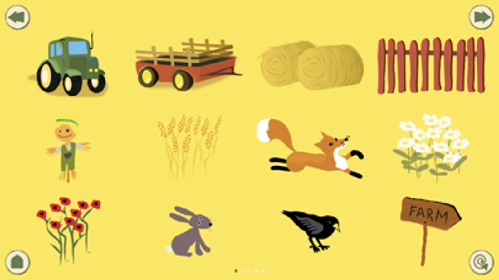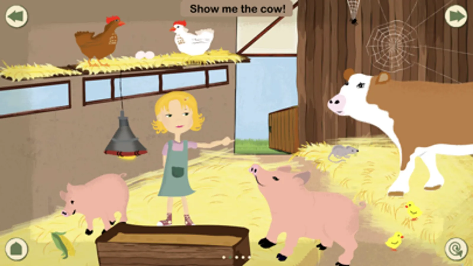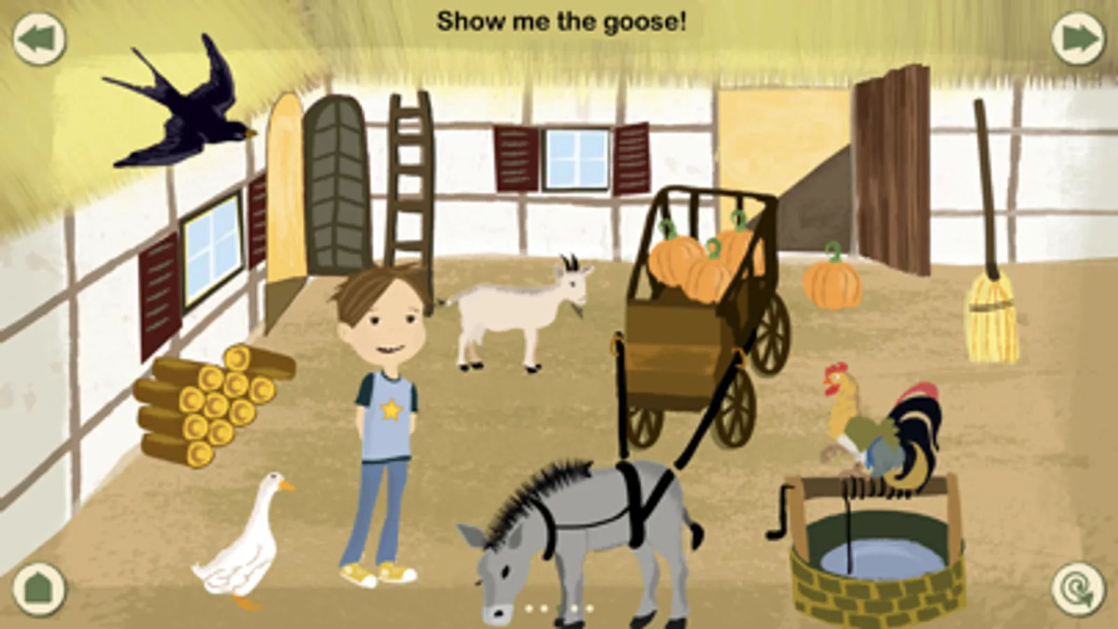 With KinderApp Farm - the best app to learn "first words" in a language with - we stand on a sunny wheat field, visit a stable with many animals, explore the farmyard, discover the vegetable garden, and enjoy being with the horses in the corral. With the app, children learn the names and pronunciations of more than 60 important objects on a beautiful farm.