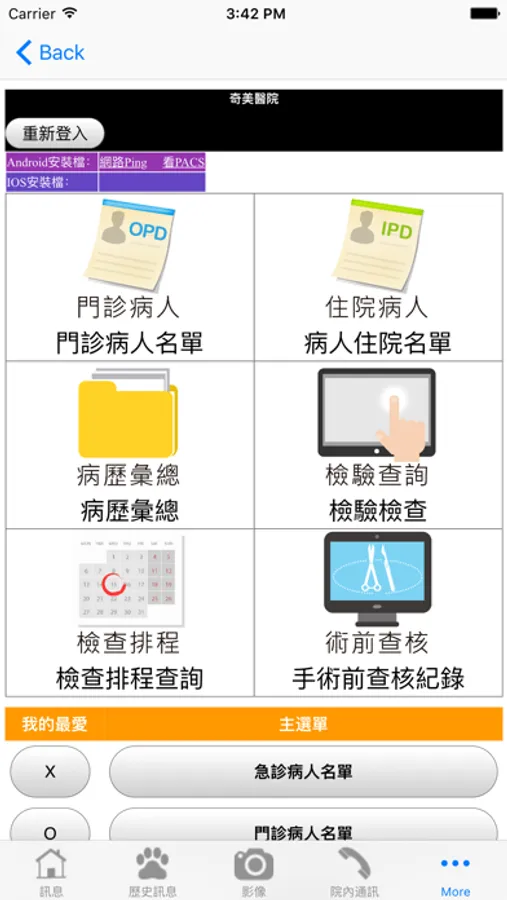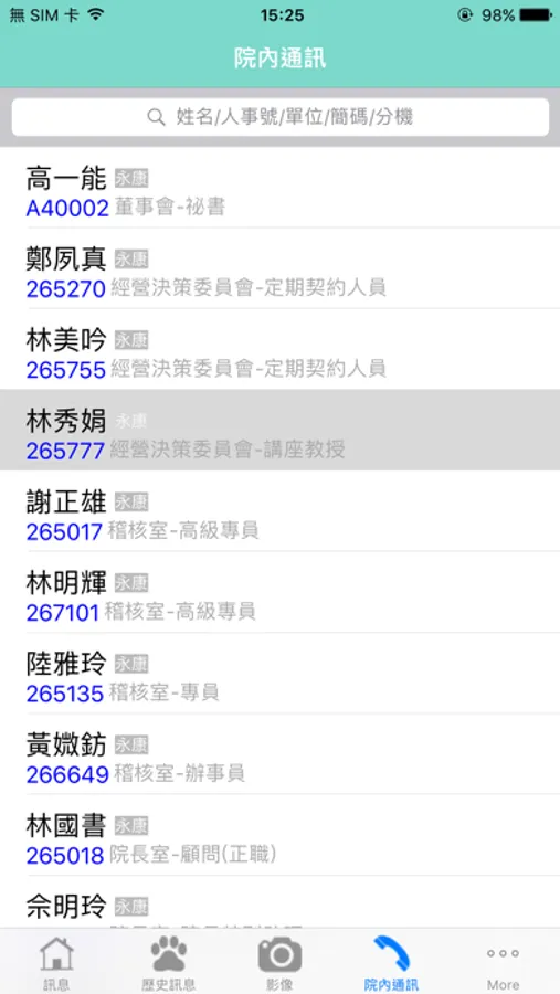 6. 通訊錄功能:與醫院員工資料連結,建立便捷的通訊路徑,在行動裝置上即可依簡單關鍵字搜尋出要找的人來進行通話,可減少繁瑣的找電話工作。