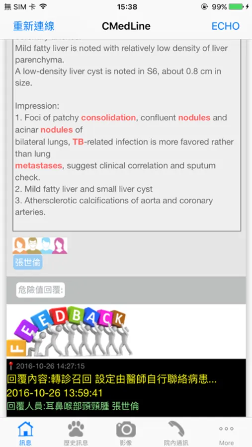 3. 危險值回覆機制:醫療團隊接收的危險值處理後,能在行動裝置直接進行處置回覆,處置後的訊息會回傳系統,醫療照護團隊可以清楚獲知病人已接受處置。