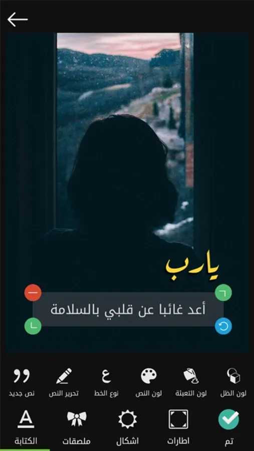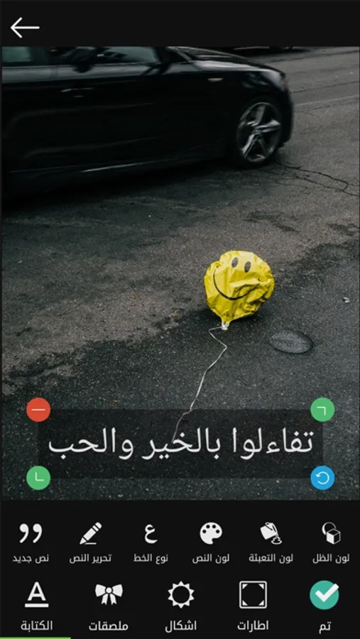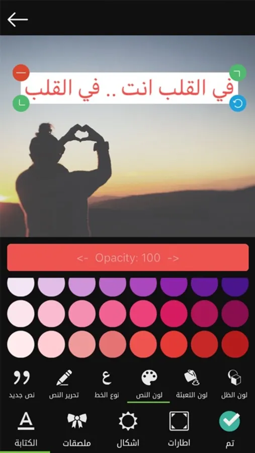 كما هو واضح بالعرض الخاص بالتطبيق وصور المتجر , التطبيق يحتوي على ادوات احترافية مميزة للتحكم بالنصوص المكتوبة على الصور والألوان والحجم