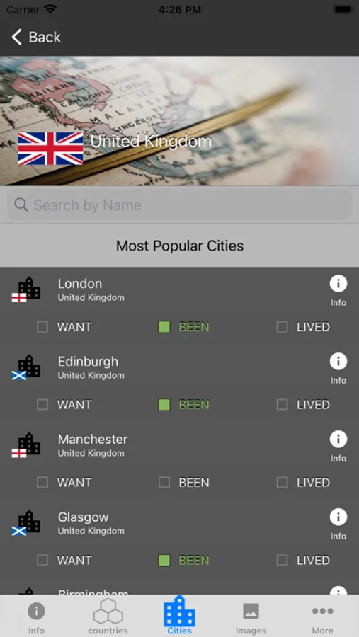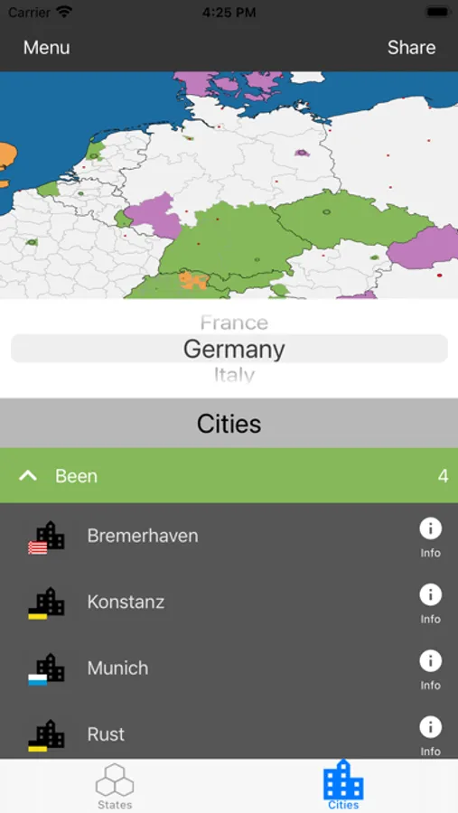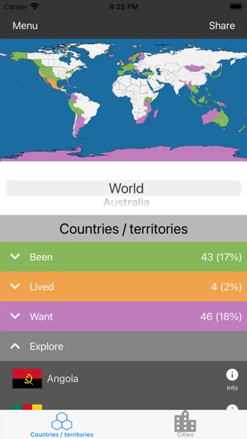 Ever wanted to keep track of all the places you've traveled to? Or show your friends what parts of the world you’ve seen? Well, “Countries Been” is just for that! It's a customized map of the world, showing all of the countries and cities you've visited, lived-in, and want to visit! Perfect for the adventurer, globe-trotter, and travel-minded person. “Countries Been” allows you to browse the world, its places, and add the ones you have already explored or want to visit to a colorful visual checklist. You can even use the world map to explore new places and learn more about them, or to see images of popular sites and attractions - useful for gathering ideas for future trips or simply satisfying your travel curiosity. You can share your map onto your favorite social networks, to compare with your friends or use it for bragging rights!