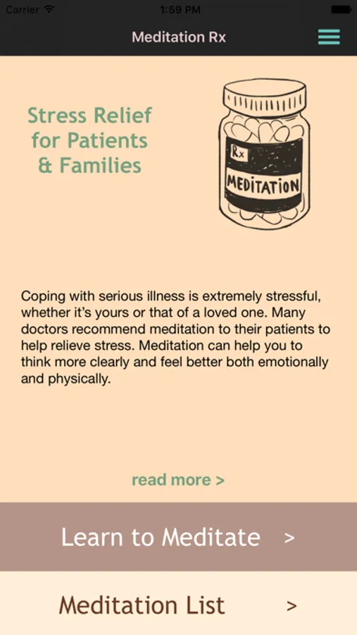 Find relief from the stress of serious illness with the Meditation Rx app. Whether you are ill or are supporting a loved one through an illness, you will find guided meditations especially designed to suit your needs. The app helps you to deal with the stresses of being ill, being in a medical setting, undergoing difficult procedures, hearing bad news and more.