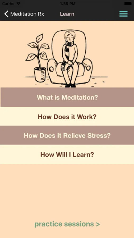 • A Learn to Meditate section with written materials, and 3 sessions for practicing meditation skills (taken from our Learn to Meditate course app).
