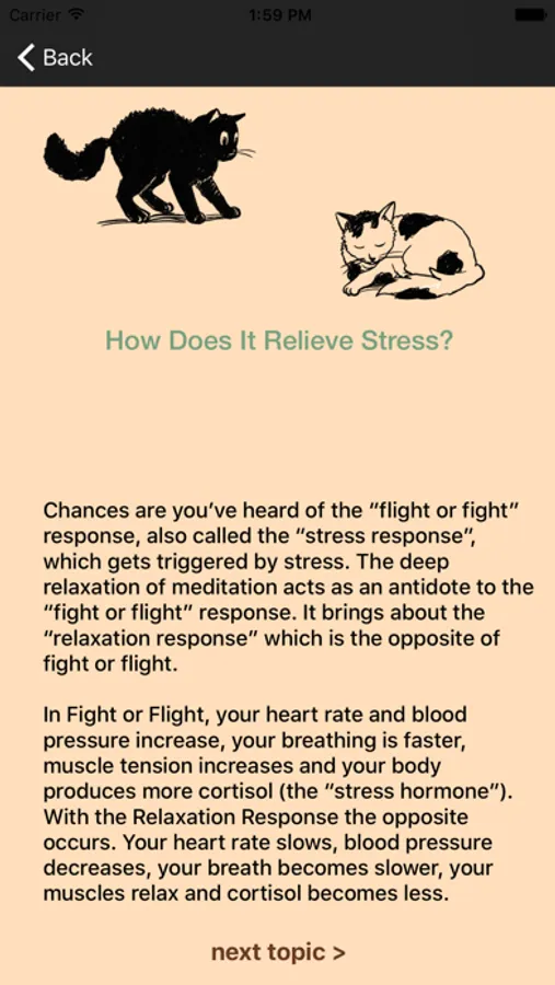 DISCLAIMER: This app is designed to provide relief from the stress accompanying illness, and is not intended for diagnosis or treatment. Although stress can cause physical symptoms, check with your health care provider to make sure they are not caused by a medical problem. Nothing on this app should be used as a substitute for the help of a qualified health professional.