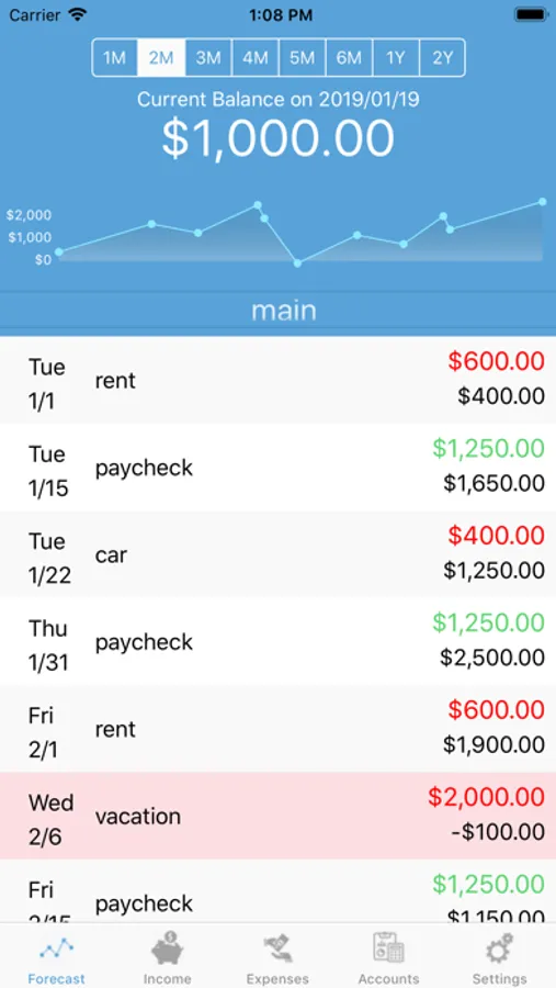 Forecast your paychecks and payments into the future by giving yourself long-term vision out over days, weeks or months.