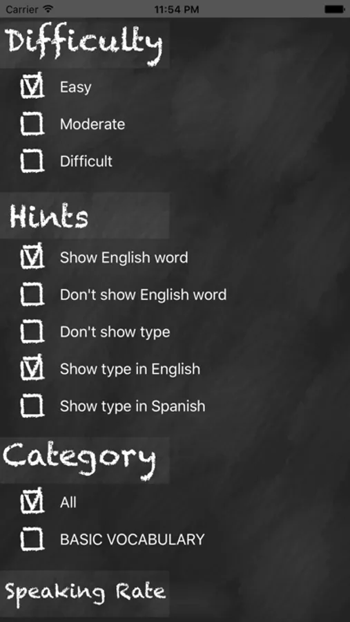 The game play is highly configurable, with 3 difficulty settings, and optional hints including the corresponding English word, and type of word (lexical category) in English or Spanish.