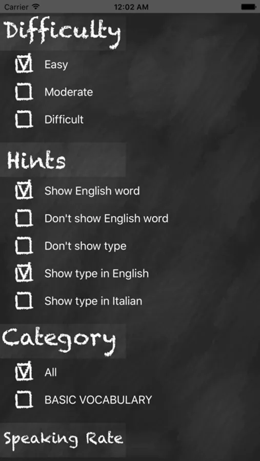 The game play is highly configurable, with 3 difficulty settings, and optional hints including the corresponding English word, and type of word (lexical category) in English or Italian.