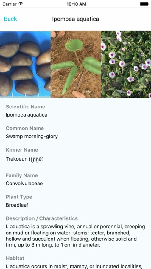 WeedID is an app to assist Cambodian farmers in identifying weeds in rice fields. It contains a "photo dictionary" of various weed species in different stages of growth.