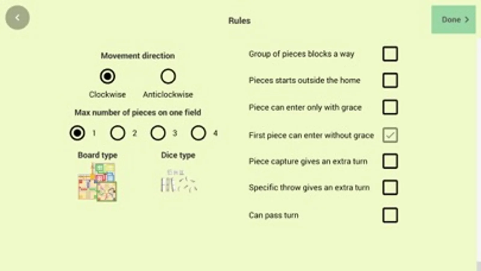 Choose if you want play with pieces, pawns or knobs. You can play in both ways, clockwise or anti-clockwise. You can select to play with a long dice, cubical dice or cowries, it's just up to you what you likes the most.