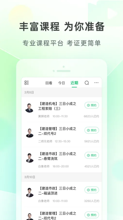 2020年全新发布的「美好明天课堂APP」覆盖N类职业考试,适用于所有职业考证用户!工程类:一建、二建、造价工程师、消防工程师、安全工程师;自考类:自考;医学类:执业药师、执业医师、执业护士、护师、初级护师、主管护师、卫生资格;会计类:初级会计职称、中级会计职称、注册会计师;经济类:中级经济师、初级经济师;金融类:基金从业、证券从业、银行从业、期货从业;公考类:公务员、事业单位;教师类:教师资格证、教师招聘、特岗教师;大学类:英语四六级、考研、成人高考、司法考试这些高含金量考试全都能自学!近百个职业考试,等你免费随身学!