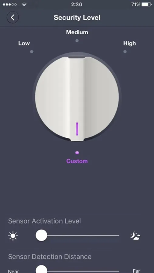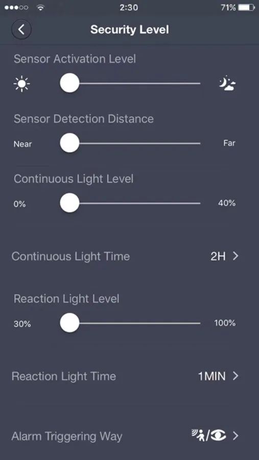 The APP allows you to choose from three, adjustable, predefined presets: LOW, MIDDLE & HIGH security, you can also set the app to CUSTOM level, allowing you to fully control your light or lights. This includes adjusting the PIR sensor detection range, brightness (LUX level) time on duration, time off etc.