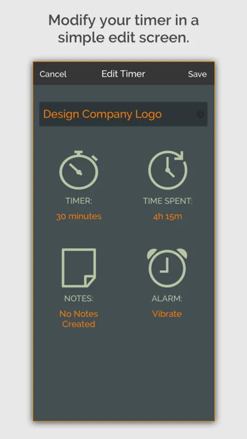 • Easily customize timer properties. (Title, Timer, Time Spent, Alarm Sound)