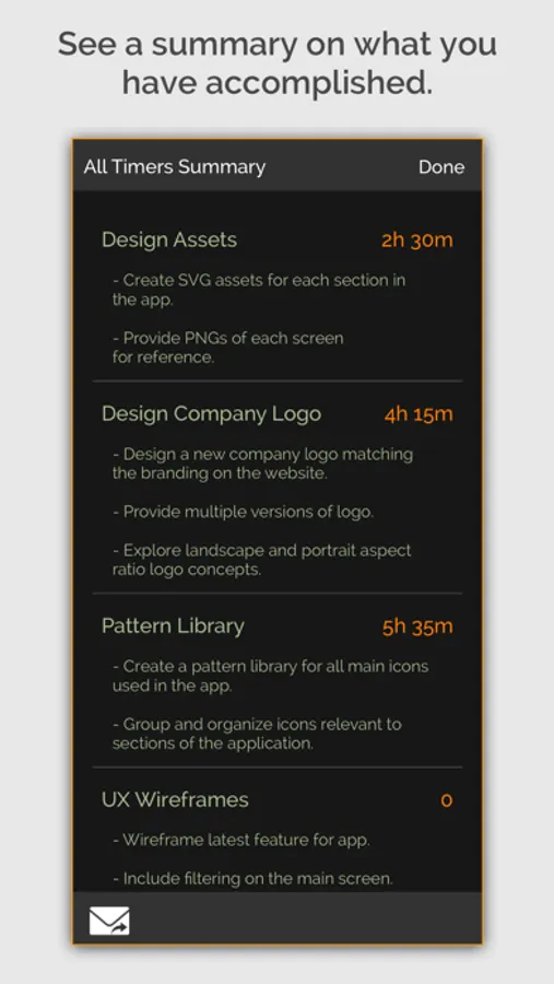 • View a summary of all your timers, which displays the time spent and all your notes.