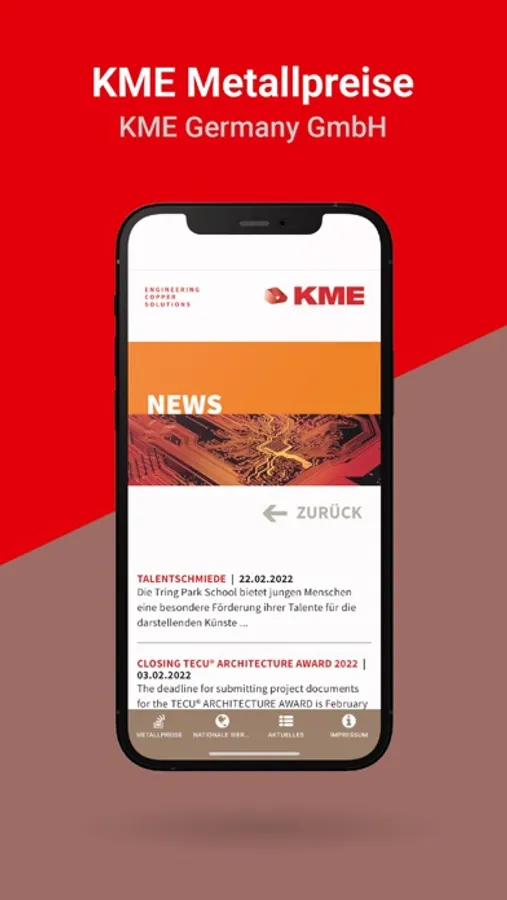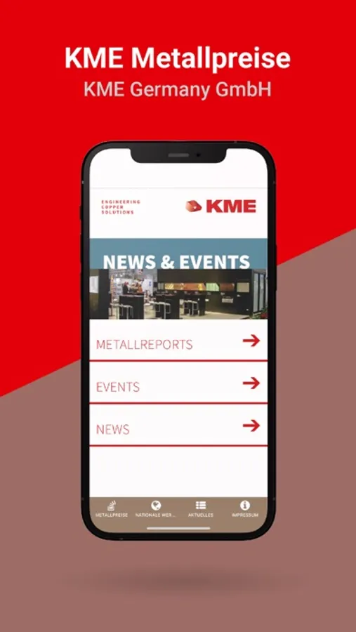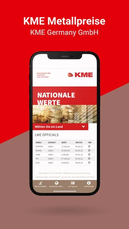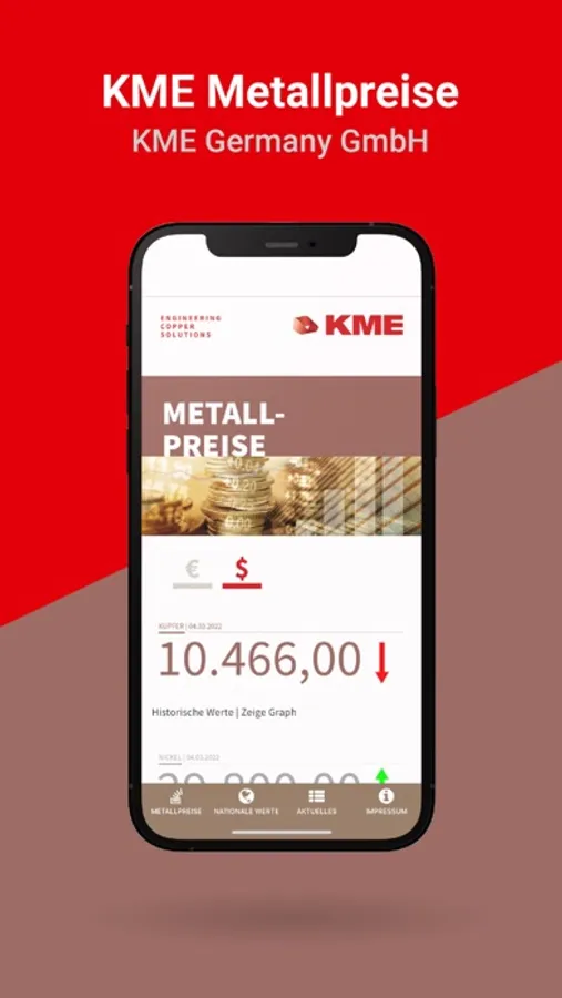 Die KME ist einer der weltweit grössten Hersteller von Erzeugnissen aus Kupfer und Kupferlegierungen und verfügt über ein weltweites Vertriebsnetz. Die App Metallpreise von KME bietet Ihnen Informationen über aktuelle Metallpreise, KME Events und Neuigkeiten. Die Metallwerte werden nach LME-Notierungen angezeigt. Als zusätzliche Informationen können Sie sich die Werte in EUR, USD oder in einem Diagramm anzeigen lassen. Die App KME Metallpreise ist kostenlos. Metallpreise sind permanenten Schwankungen unterworfen und können sich manchmal innerhalb von Minuten sehr stark verändern. Die, in dieser App, genannten Preise sind daher rein statistischer Natur und nur als Indikationen zu betrachten. Alle Angaben sind ohne Gewähr.