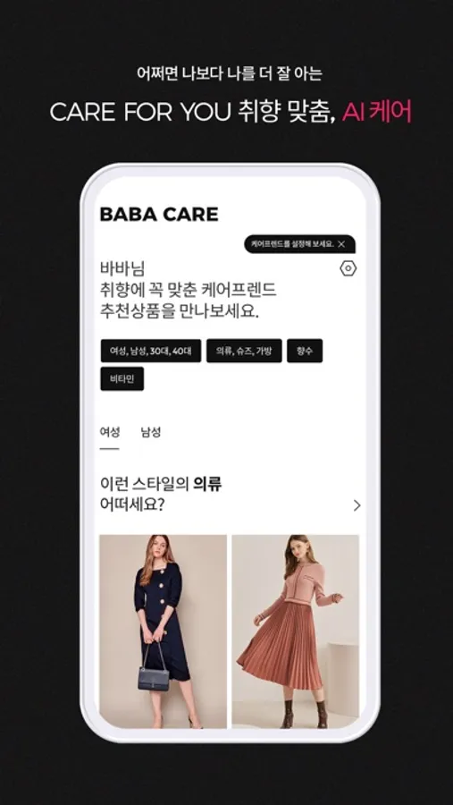 빅데이터를 기반으로한 토탈케어 서비스는 AI퍼스널쇼퍼가 다양한 라이프 스타일에 맞춰 상품을 큐레이션 해줍니다.