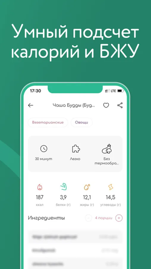 - пошаговая инструкция к каждому рецепту с ингредиентами и калориями;