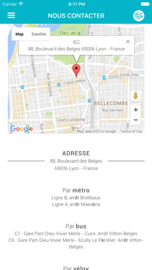 Situés en plein cœur de Lyon, à proximité du parc de la Tête d'Or, ses locaux vous offrent des facilités d'accès et des installations aménagées pour que vous puissiez participer aux études dans les meilleures conditions.