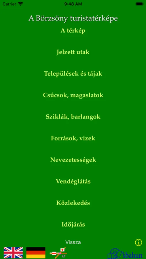 A használati útmutatót a kiválasztott térkép kezdő látványának alsó részén lévő „info” gombra tapintva lehet megtekinteni.