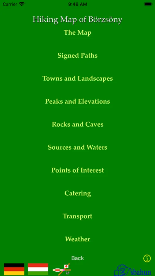 Tapping the icon of an already selected signed path the application shows the whole path (it follows the path from the start to the end point). You may stop the animation by double tapping on the map. The animation continues after tapping the Unlock map button at the bottom. Tapping the map during animation you get the toolbar, where using the Back button you may go back to the description of the signed path.