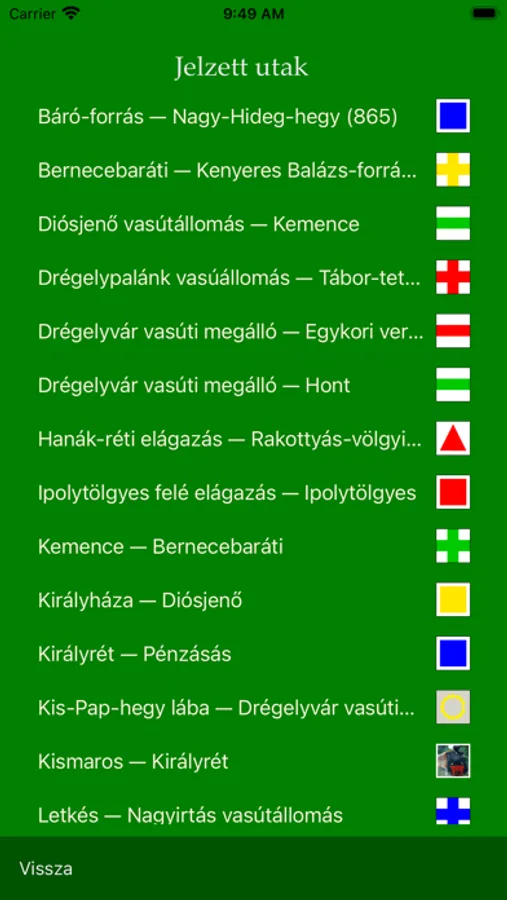 A kiválasztott jelzett út címsora alatt megjelenő turistaút-jelre tapintva az alkalmazás megmutatja az útvonalat („végig megy”) az úton. Az út bemutatását megállíthatjuk és folytattathatjuk ráduplázással illetve a rögzítés feloldásával. A rátapintáskor megjelenő „Vissza” gombbal leállíthatjuk az út bemutatását.