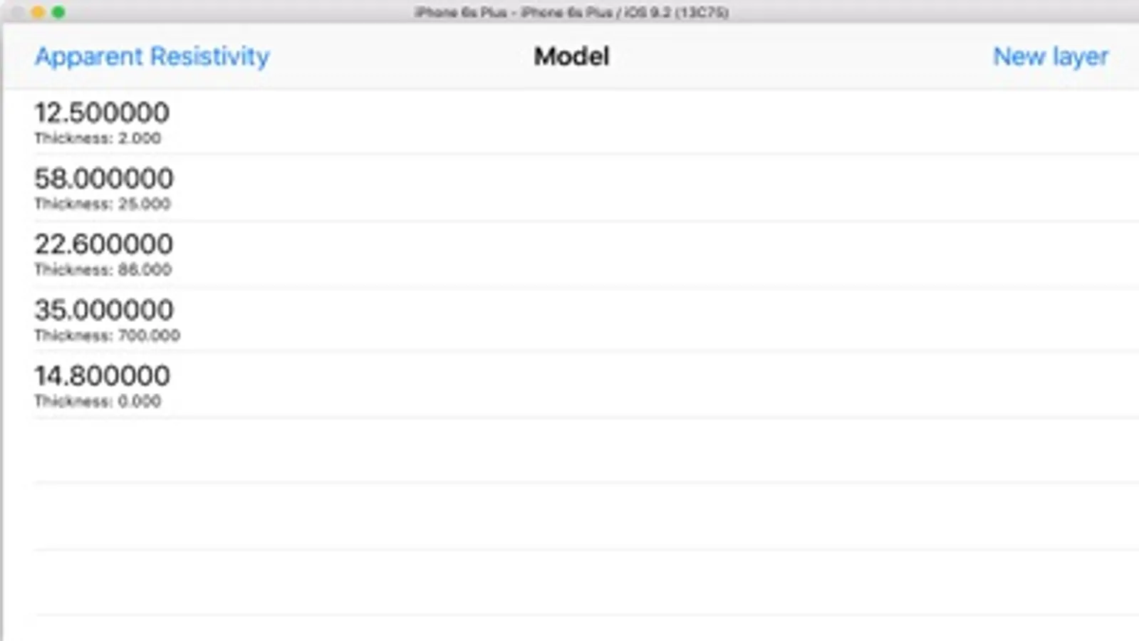 The theoretical terrain model is composed of a set of layers. You can add, remove and sort the layers of your theoretical model as desired. Each layer has two values: resistivity and thickness. You can add any number of layers to your model.