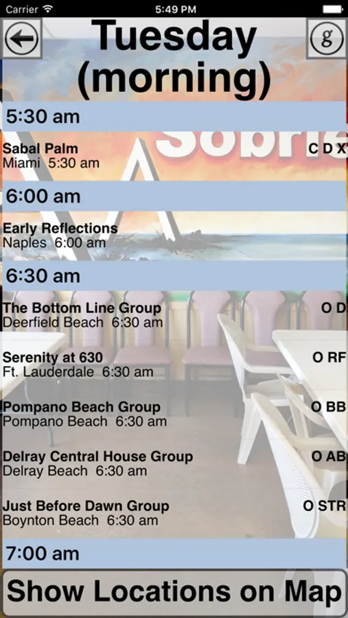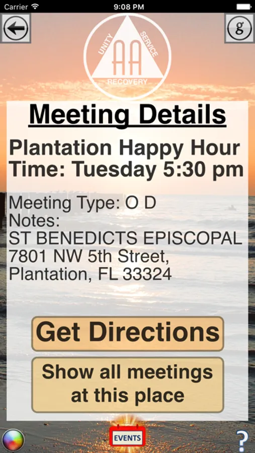 This app is a full list of Alcoholics Anonymous meetings within South Florida -- including Miami, Fort Lauderdale, Naples, Lee County (Fort Myers, Cape Coral, Sanibel Island), North and South Palm Beach (Delray Beach, Boca Raton, Deerfield Beach, Lake Worth), Charlotte county, and Orlando. Conveniently search for meetings by day and time, and the app even provides directions. Look up all meetings at a given meeting location or visually see all selected meetings on a map.