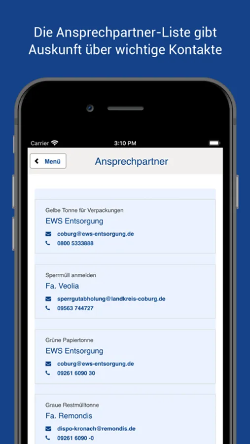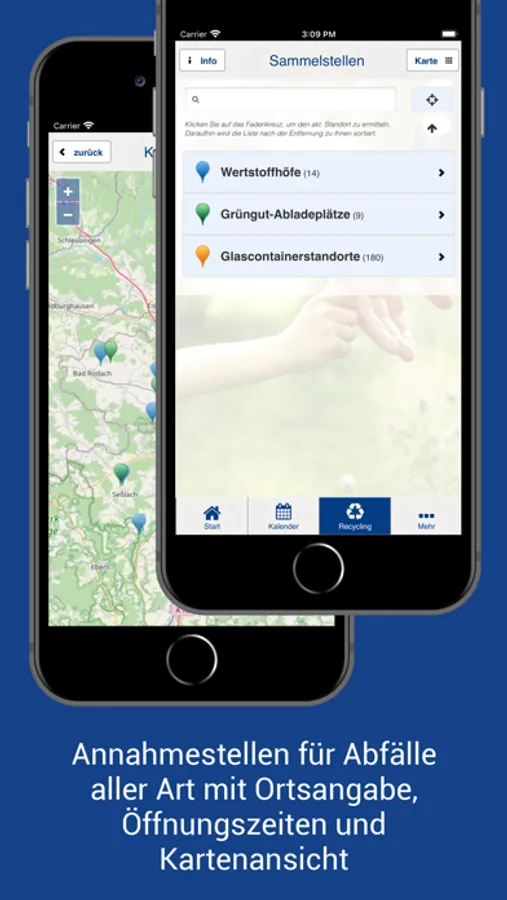 * Annahmestellen für Abfälle aller Art mit Ortsangabe und Öffnungszeiten, inkl. Kartenansicht und Navigation.
