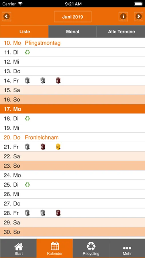 * Vergessen, die Tonne herauszustellen? Mit der Erinnerungsfunktion die Termine für die Leerung in den eigenen Kalender übertragen.