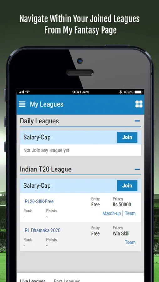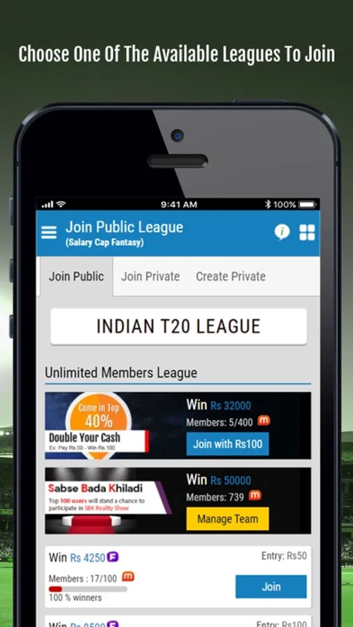 Fantasy Sport is an online game where you create a virtual team of real cricket, football or kabaddi players and score points depending on how your chosen players perform in real life matches. To win a league, you must work towards attaining the maximum points and the No. 1 rank on the leader-board. To make things even more interesting, With CricBattle you can play free leagues for daily and tournament long fantasy leagues and win free prizes. You can choose to join any of the ongoing fantasy leagues or even create your own private fantasy leagues and challenge your friends to play with you. Go for the big win by joining the special leagues.