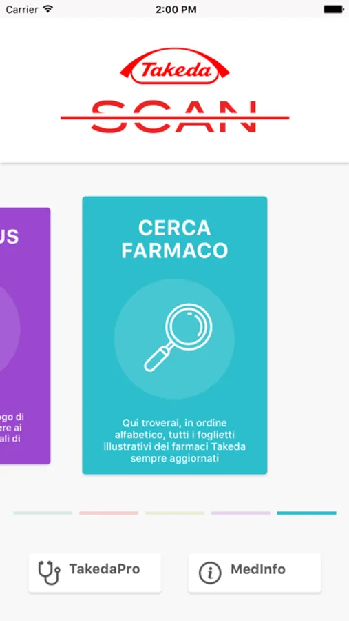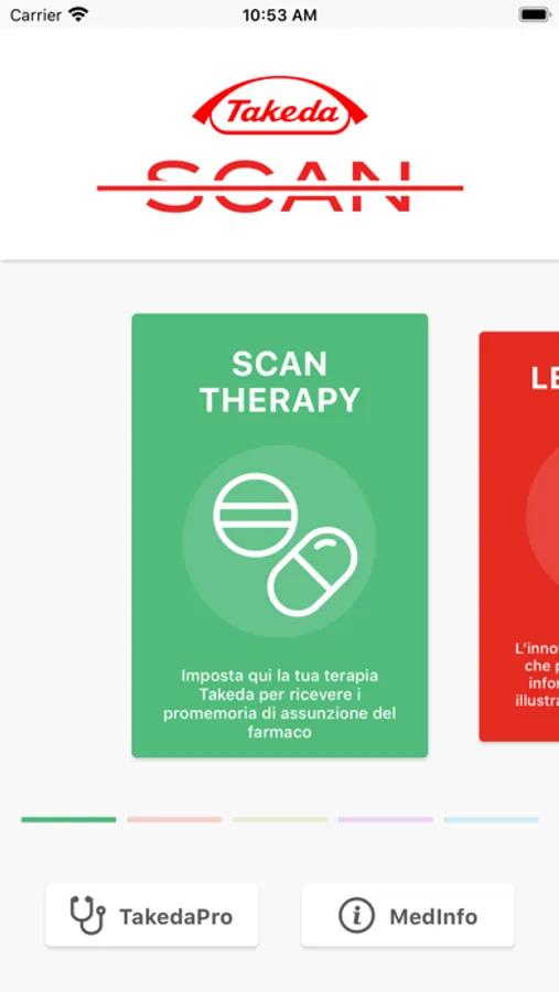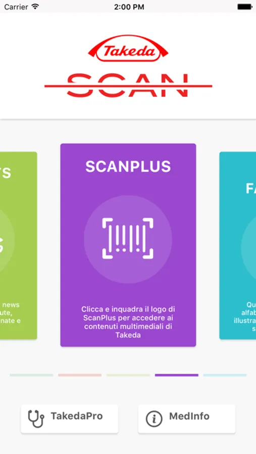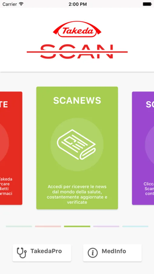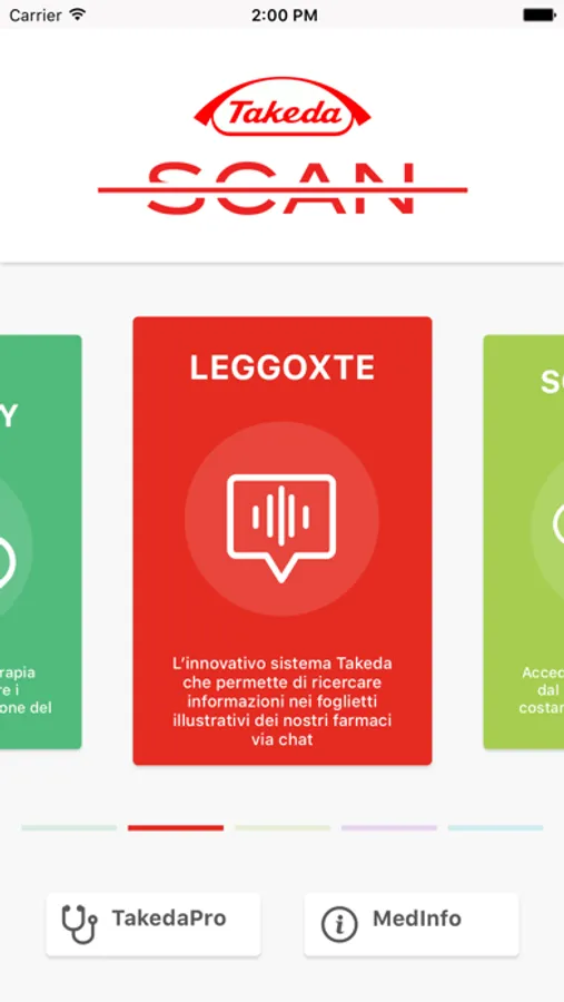 TakedaScan è la app di servizi per la salute di Takeda Italia rivolta ai cittadini e agli operatori sanitari. TakedaScan dà accesso al chatbot LeggoXTe che guida gli utenti nella consultazione e ricerca di informazioni contenute nei foglietti illustrativi dei farmaci Takeda. La funzione ScaNews guida l'utente nella navigazione sui principali social network alla ricerca di news relative al mondo della salute in diverse aree terapeutiche. La navigazione, filtrata da Fake-News, permette di accedere solo a contenuti di alto e comprovato valore scientifico. Con la funzione Scanplus è possibile accedere ai contenuti di realtà aumentata di Takeda Italia.
